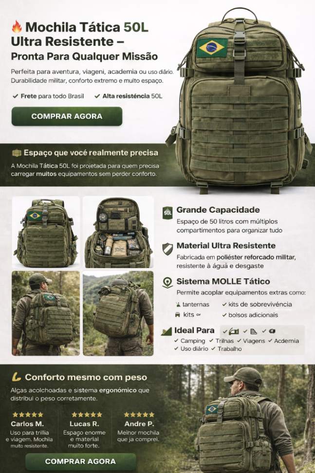 Projetada para aventura, sobrevivência, viagem ou uso diário, ela suporta peso, chuva e uso intenso sem te deixar na mão.